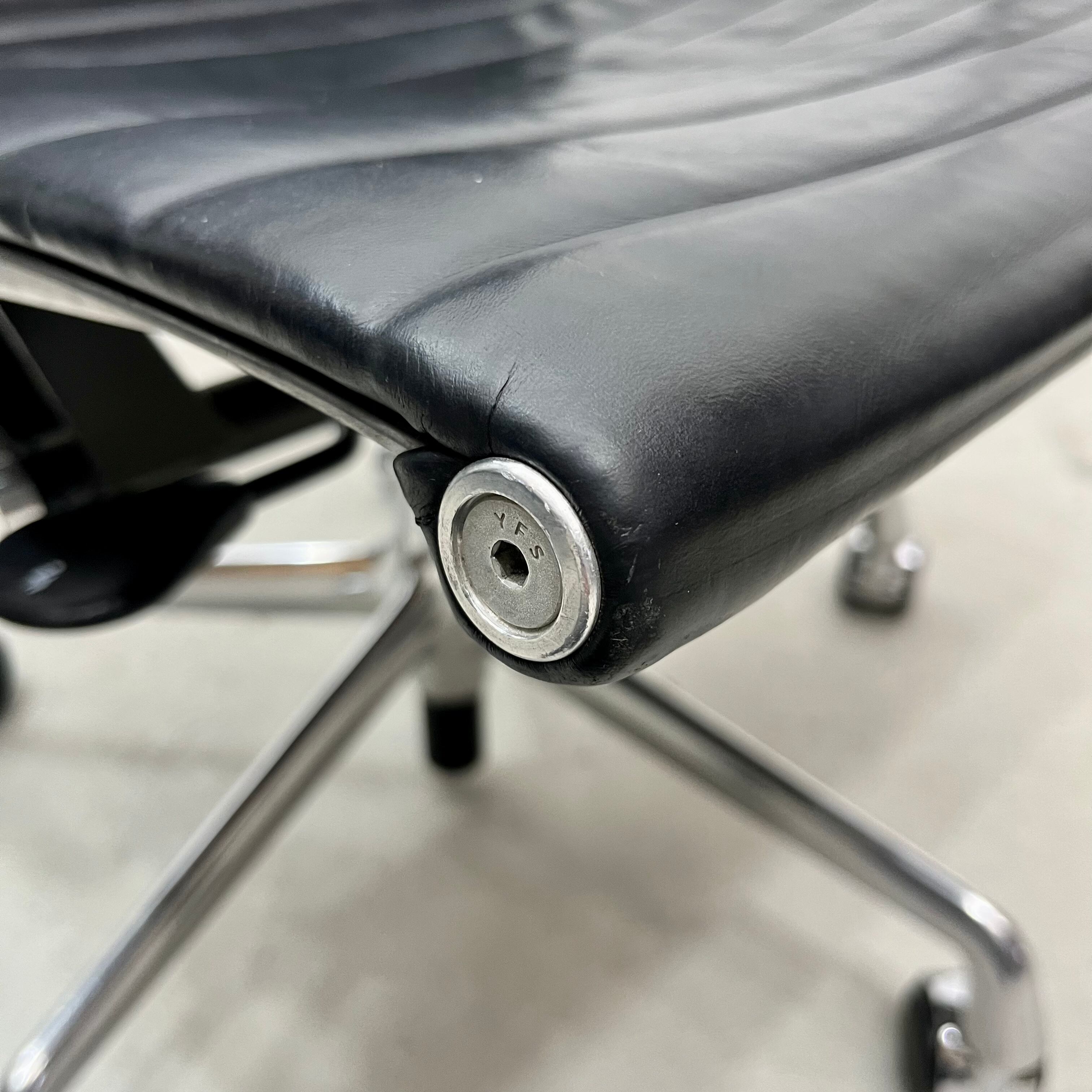アルミナムチェアお決まりのアーム部分の剥がれ、座面の角部分のレザーに若干のスレがあります。